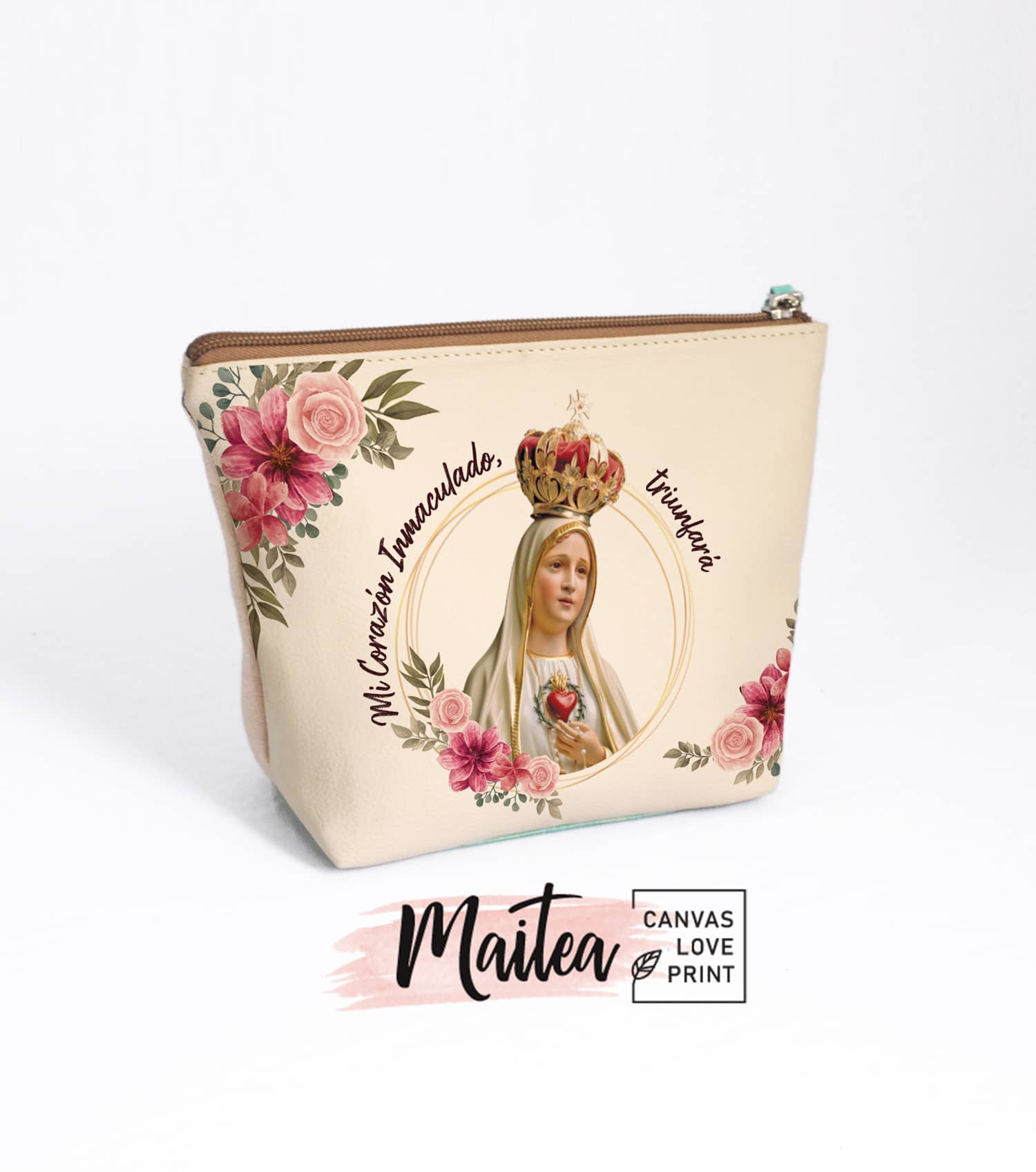 Cosmetiquera de la Virgen de Fátima, elaborada en Cuero PVC Nacional que no se pela ni se descascara, estampado con impresión digital látex full color. Descubre nuestras elegantes y prácticas cartucheras y cosmetiqueras religiosas, diseñadas para llevar tus artículos esenciales con estilo y devoción. Con detalles inspirados en la fe, estas piezas son perfectas para aquellos que buscan combinar funcionalidad con espiritualidad.” Regalos religiosos