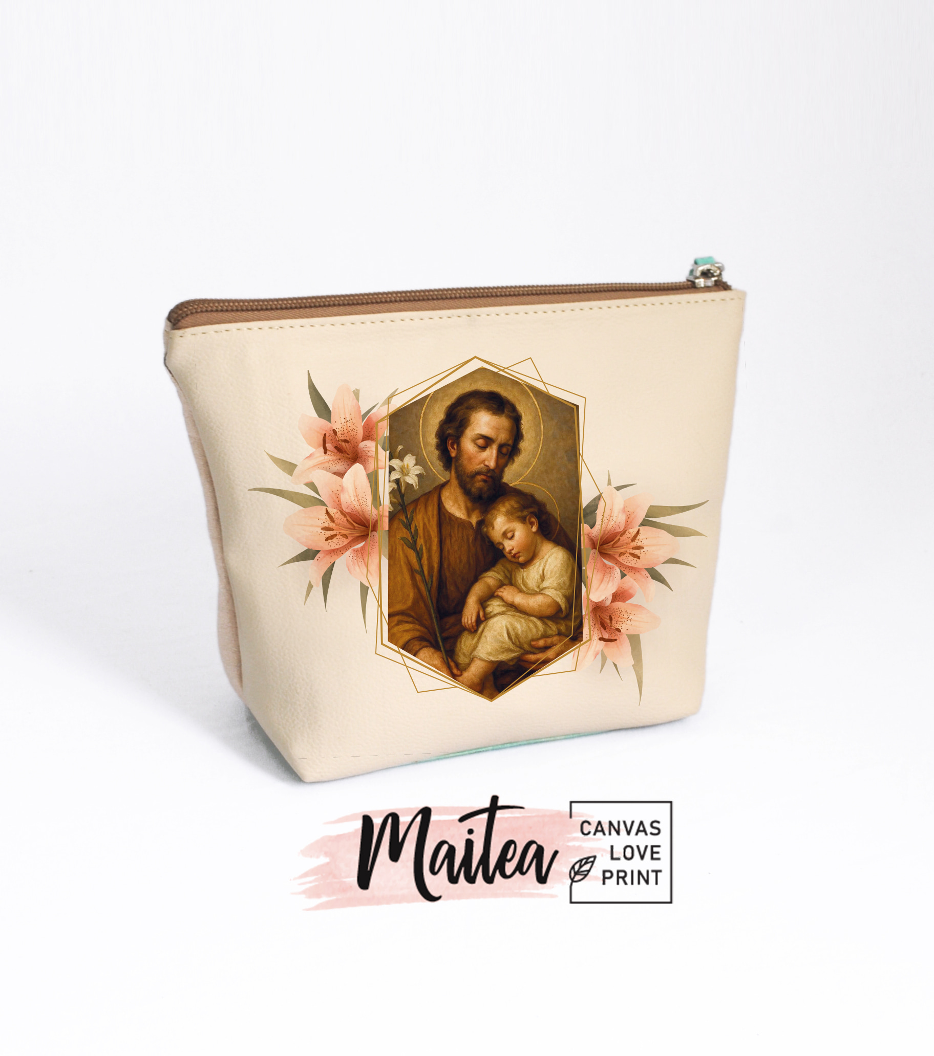 Cosmetiquera de San José, elaborada en Cuero PVC Nacional con impresión digital látex full color. Devoción a San José