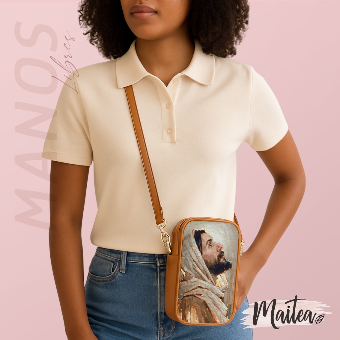 Sus motivos católicos inspiran devoción y protección donde vayas. Pequeño, práctico y elegante, con espacio perfecto para tu celular, documentos, gafas y llaves. Diseño artesanal con acabados de marroquinería impecables, hecho para acompañarte con gracia y propósito cada día.