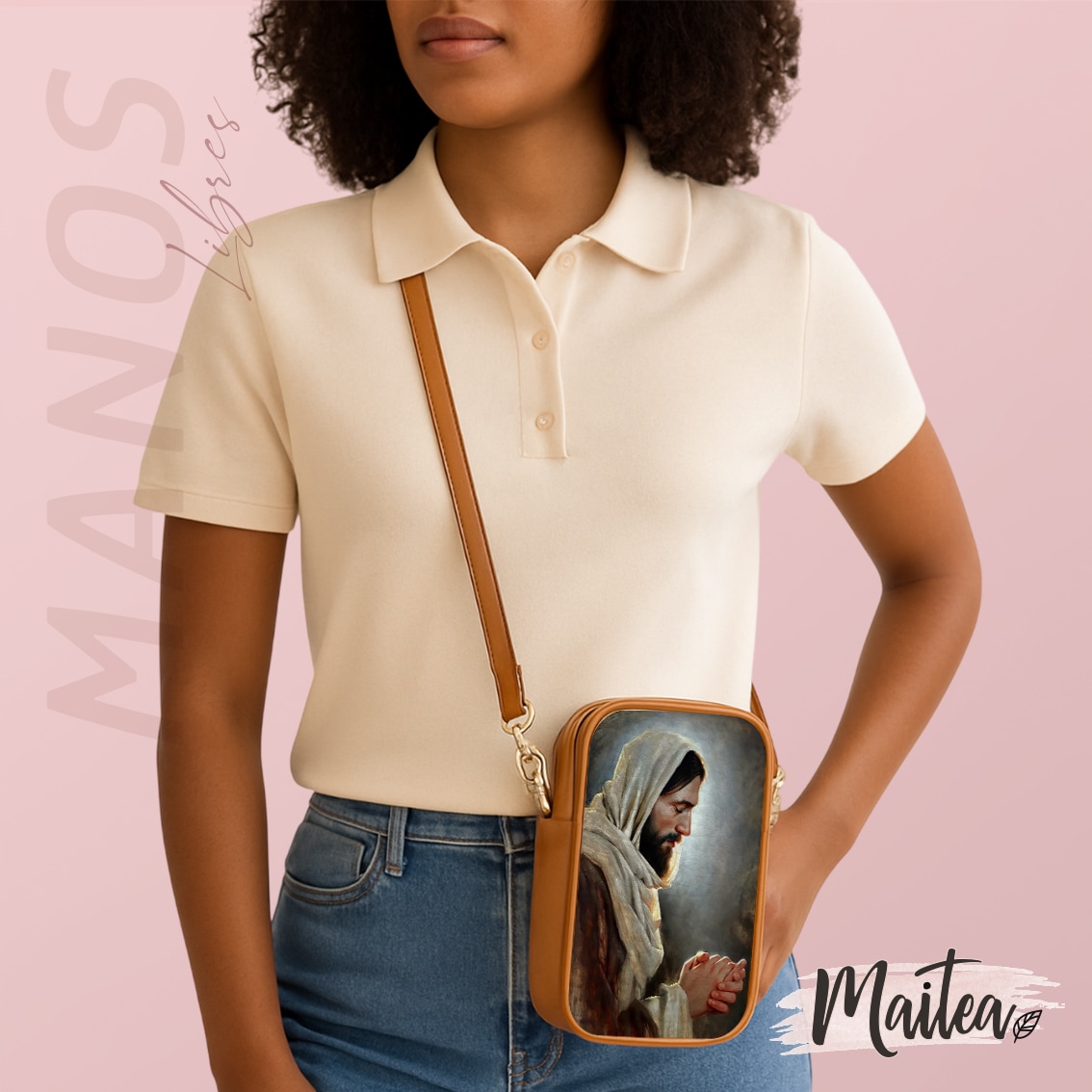 Sus motivos católicos inspiran devoción y protección donde vayas. Pequeño, práctico y elegante, con espacio perfecto para tu celular, documentos, gafas y llaves. Diseño artesanal con acabados de marroquinería impecables, hecho para acompañarte con gracia y propósito cada día.