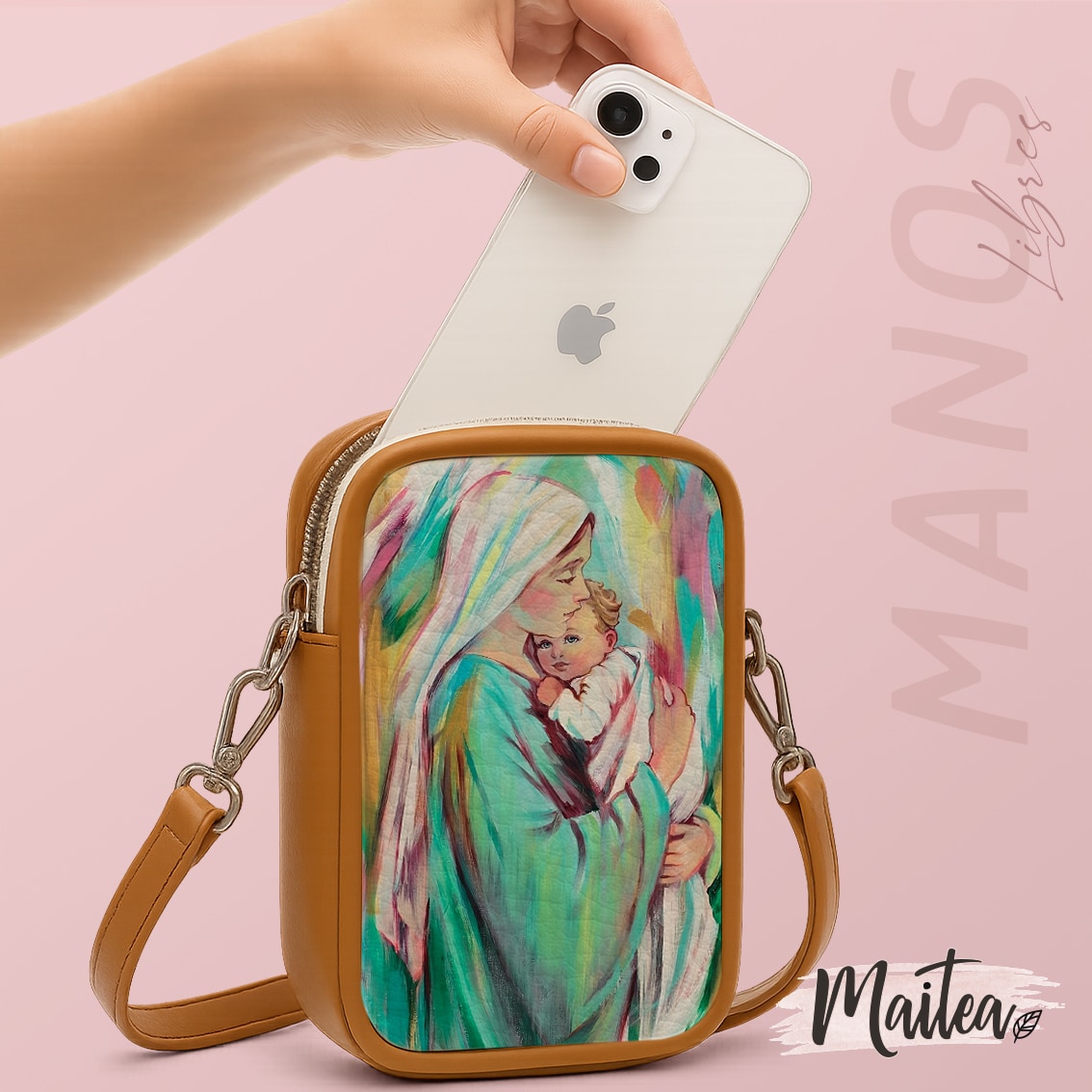 Sus motivos católicos inspiran devoción y protección donde vayas. Pequeño, práctico y elegante, con espacio perfecto para tu celular, documentos, gafas y llaves. Diseño artesanal con acabados de marroquinería impecables, hecho para acompañarte con gracia y propósito cada día.