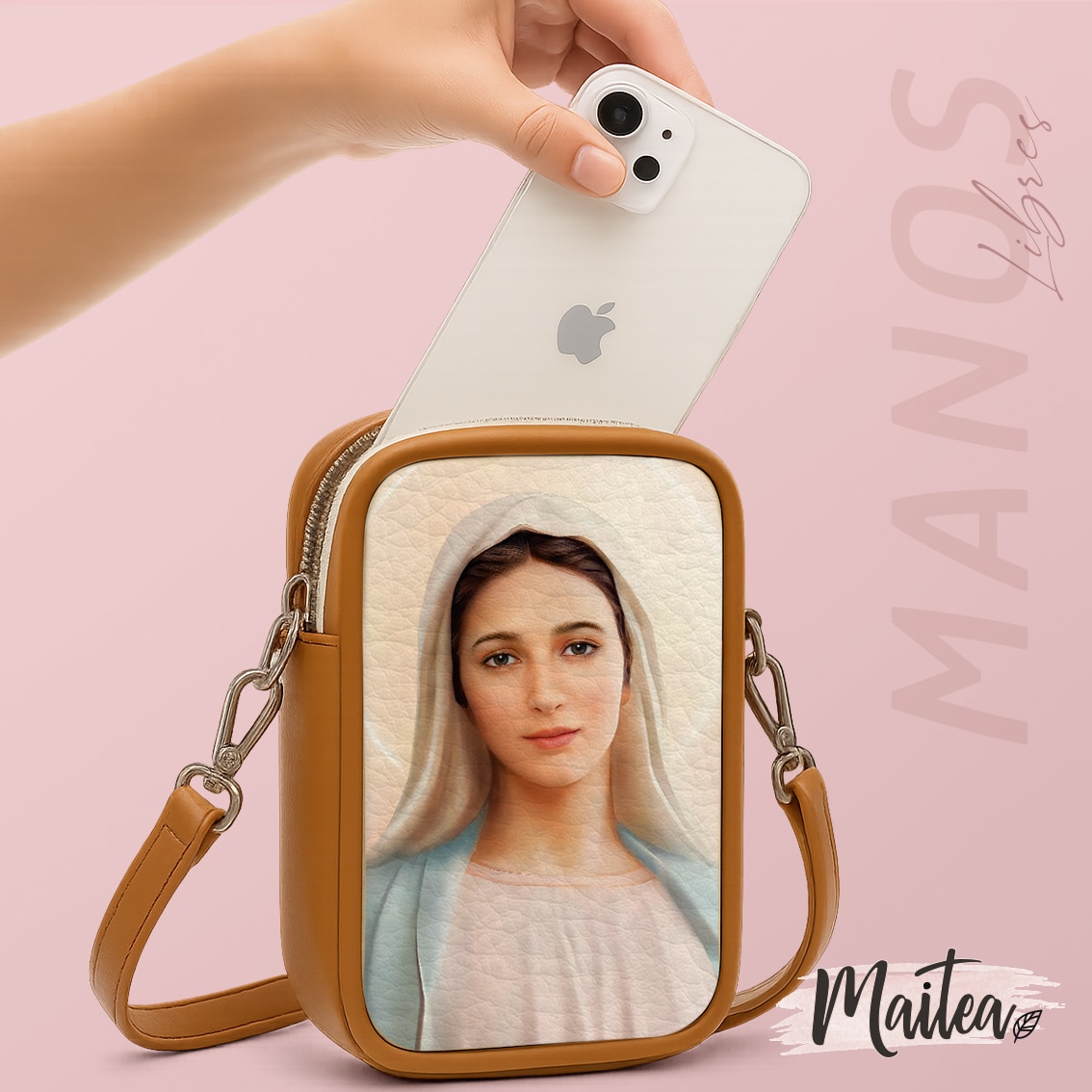 Sus motivos católicos inspiran devoción y protección donde vayas. Pequeño, práctico y elegante, con espacio perfecto para tu celular, documentos, gafas y llaves. Diseño artesanal con acabados de marroquinería impecables, hecho para acompañarte con gracia y propósito cada día.