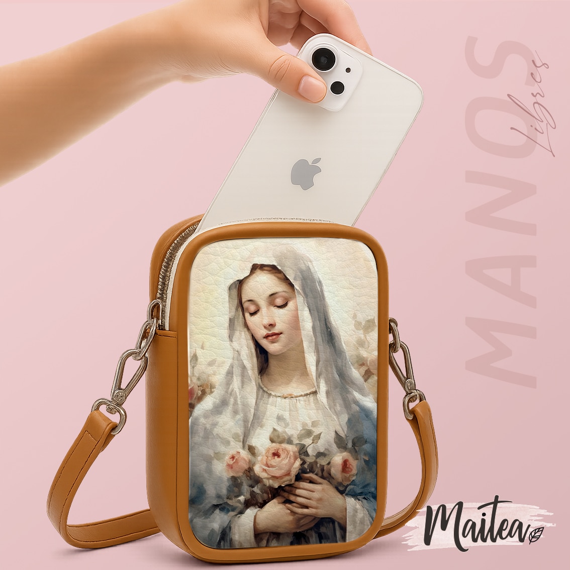 Sus motivos católicos inspiran devoción y protección donde vayas. Pequeño, práctico y elegante, con espacio perfecto para tu celular, documentos, gafas y llaves. Diseño artesanal con acabados de marroquinería impecables, hecho para acompañarte con gracia y propósito cada día.
