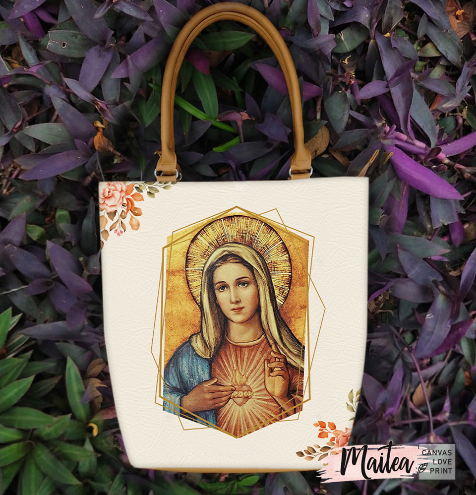 Bolso tipo Playero impreso con el Inmaculado Corazón de la Virgen en PVC nacional full color digital látex, tintas ecológicas. Bolsos de la Virgen