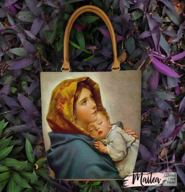 Lleva contigo un hermoso bolso religioso de la Virgen María con el Niño Jesús. Además, su diseño exclusivo está estampado en cuero PVC con impresión de alta calidad.