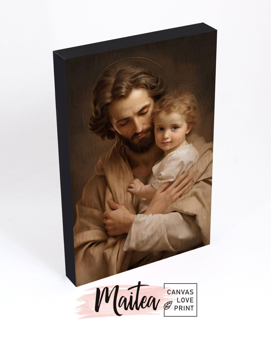 Cuadros religiosos de alta calidad, impresos en lienzos de 100% algodón con tintas ecológicas y duraderas. Embellece tu espacio con imágenes religiosas que inspiran fe y devoción. Retablo en lienzo de San José Guardián del Salvador.