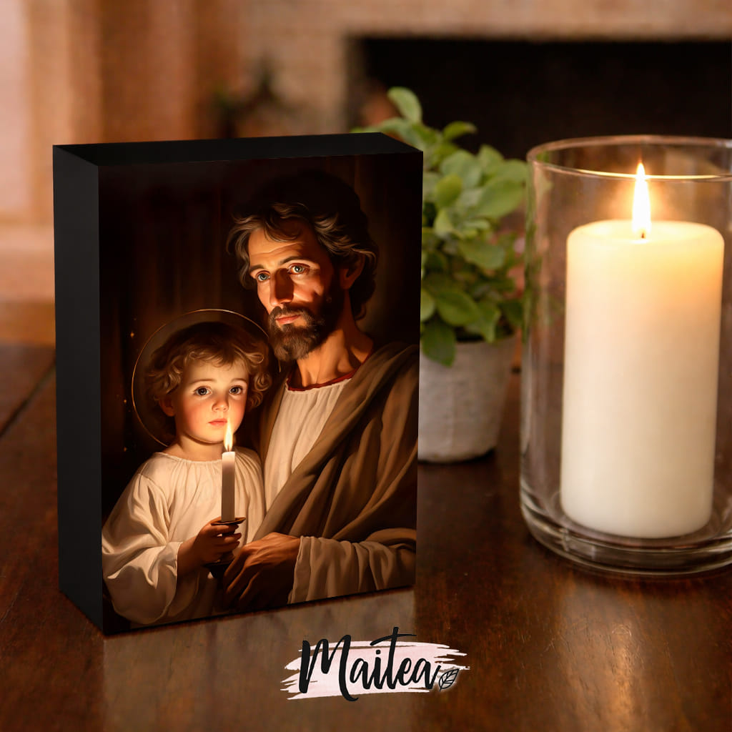 Cuadros religiosos de alta calidad, impresos en lienzos de 100% algodón con tintas ecológicas y duraderas. Embellece tu espacio con imágenes religiosas que inspiran fe y devoción. Retablo en lienzo de San José luz de Jesús