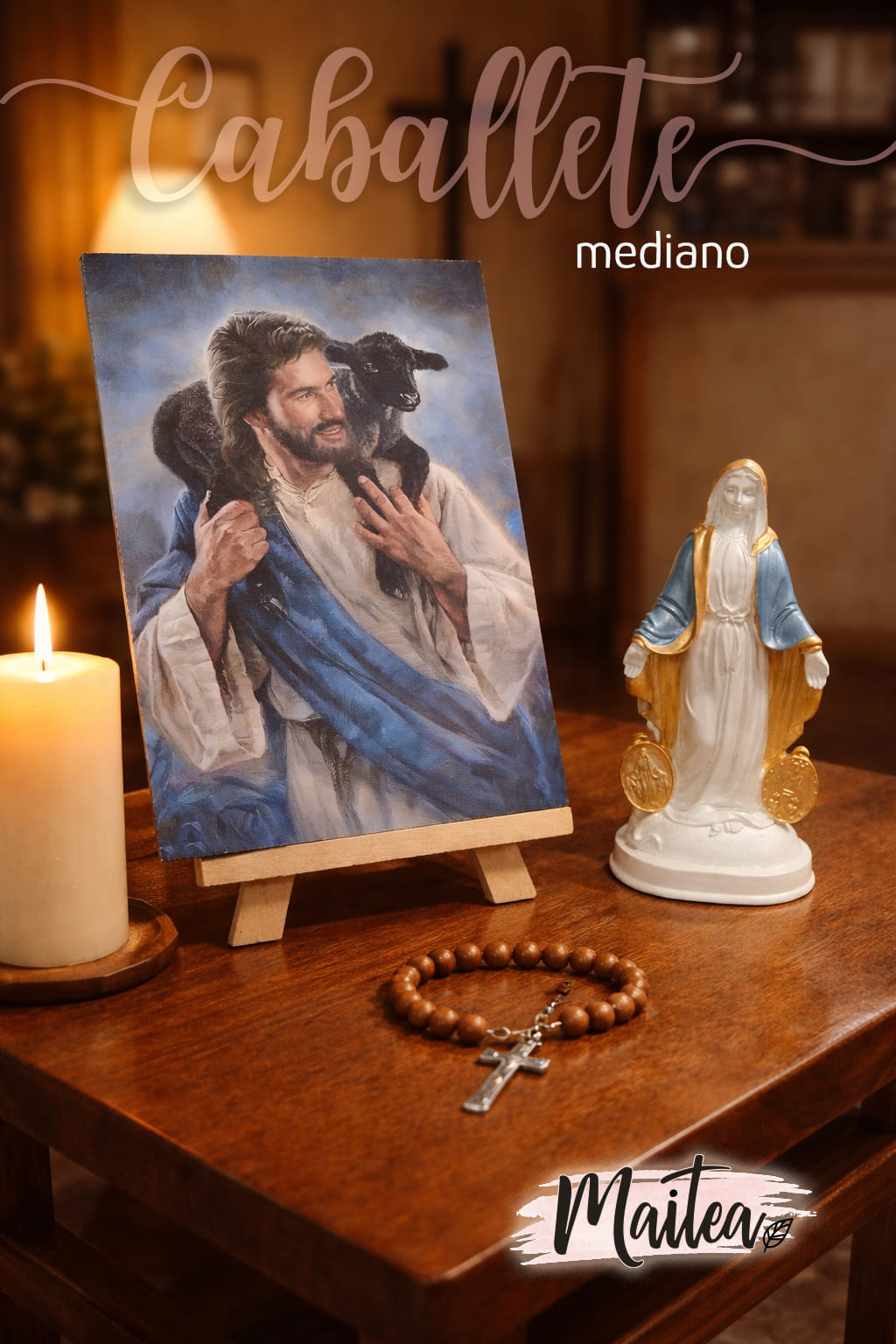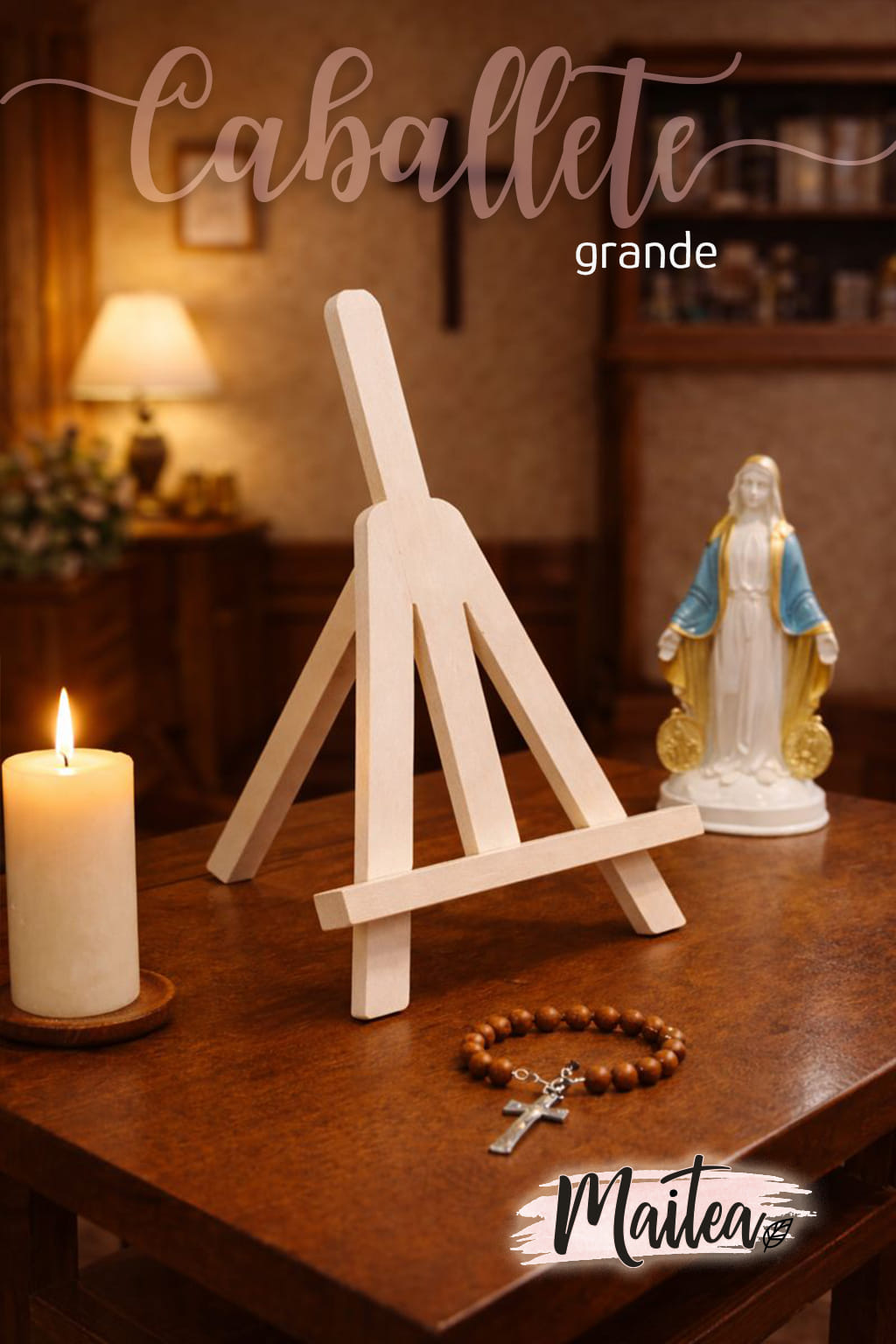 Trípode o caballete para retablos religiosos Maitea, ideal para sostener nuestros retablos con estabilidad y elegancia. Diseño artesanal y minimalista para realzar el retablo en altares. Ligero, funcional y armonioso, es perfecto para retablos católicos de distintos tamaños. Producto exclusivo de Maitea.